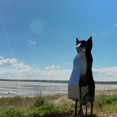 Sculpture en double anamorphose, représentant à la fois le chat, le rocher et le bernique qui a le privilège d'être exposé sur la côte, devant la baie de Goulven, près du chemin de randonnée "Le circuit du phare"